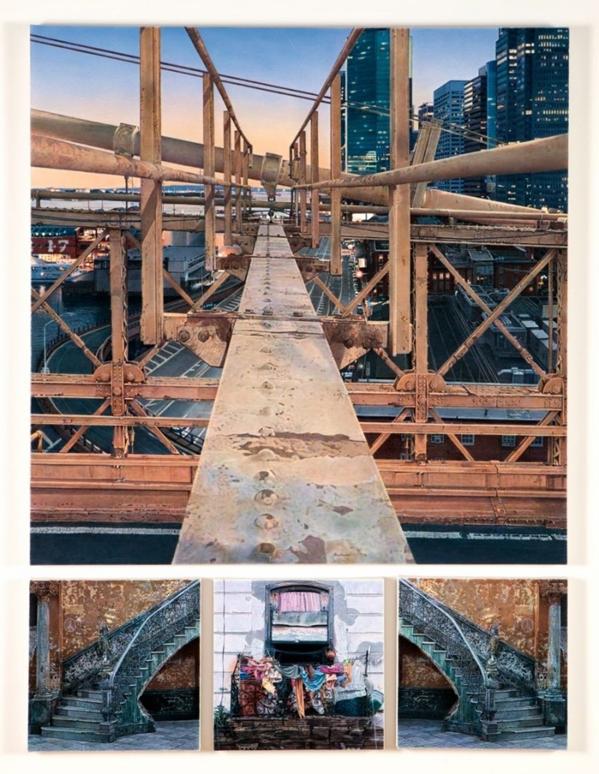 Cada cuadro, que está inspirado en fotografías y está pintado con un aerógrafo, de 55 años, es la suma de tres paneles individuales separados por espacios de 2,54 centímetros uno del otro.