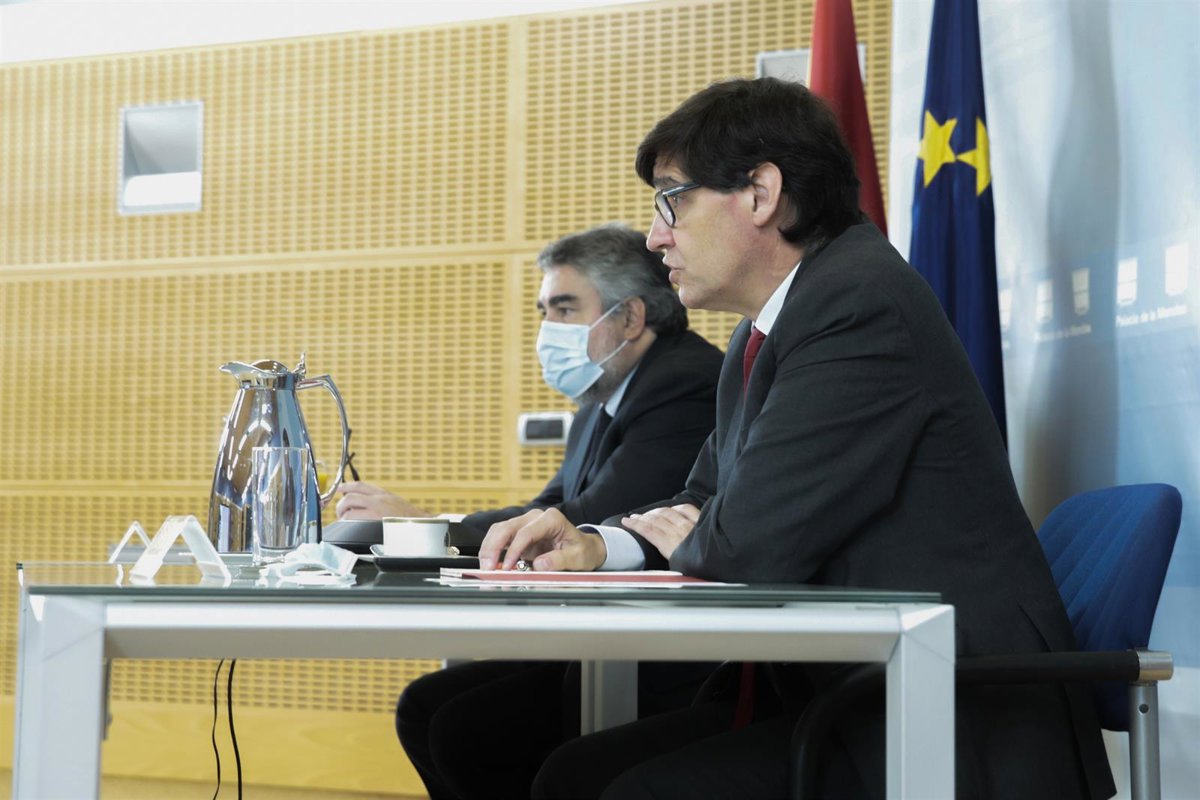 Los ministros de Sanidad, Salvador Illa, y de Cultura y Deporte, José Manuel Rodríguez Uribes, en la reunión con los consejeros de Sanidad y de Cultura de las CC.AA. Y con la Federación Española de Municipios y Provincias el 16 de octubre de 2020. - POOL MONCLOA WWW.LAMONCLOA.GOB.ES / JOSE MARIA CUA