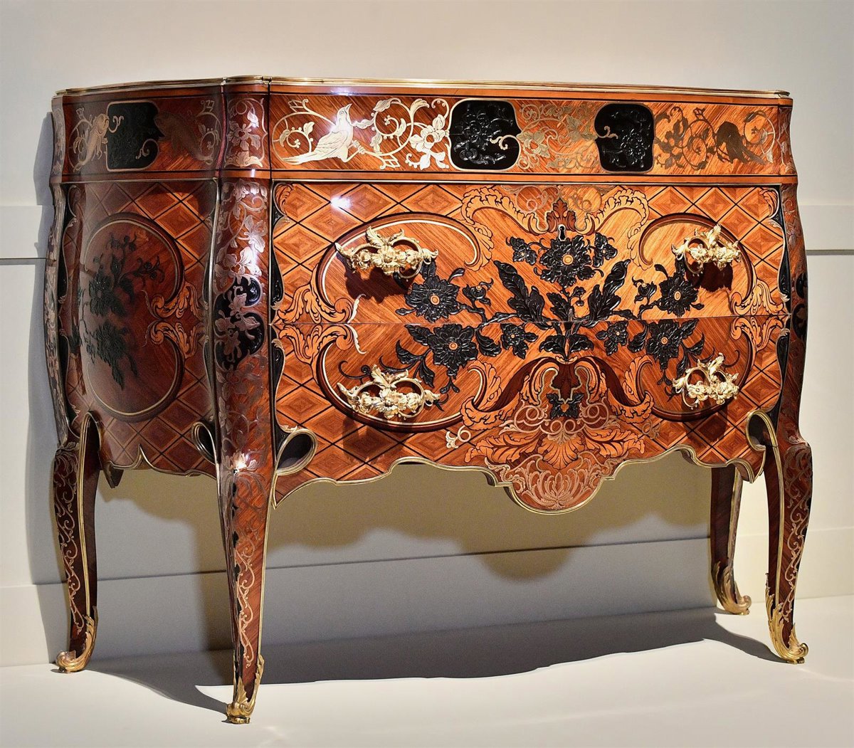 Según Patrimonio Nacional, la Cómoda está fabricada con maderas finas de Indias, como el ébano, el palosanto o el limoncillo, y lleva incrustaciones en bronce y latón. Asimismo, su ornamentación tiene como protagonista a la peonía, flor relacionada en el ámbito real chino con la nobleza, el honor y la fuerza imperial. "Gracias a la gran calidad de los materiales empleados la cómoda ha permanecido casi intacta hasta hoy", ha señalado el conservador.