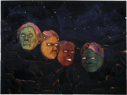 Este cuadro, que abre la exposición de la Fundación Santander está elaborado con materiales como conchas de madreperla, piel labrada u hojas de árbol. Su autor, quien en sus obras reelabora el sueño americano, ha sustituido en ésta a los cuatro presidentes de Estados Unidos por cuatro mujeres, famosas por haber defendido la igualdad frente a las injusticias.