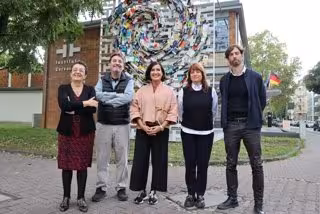De izq a dcha: Rosario Álvarez, Luis García Montero, Irene Larraza, María José Gálvez y Pere Almeda, posan frente a la instalación artística "Espacios Ocupados" de Alicia Martín en la fachada del Cervantes de Fráncfort - INSTITUTO CERVANTES