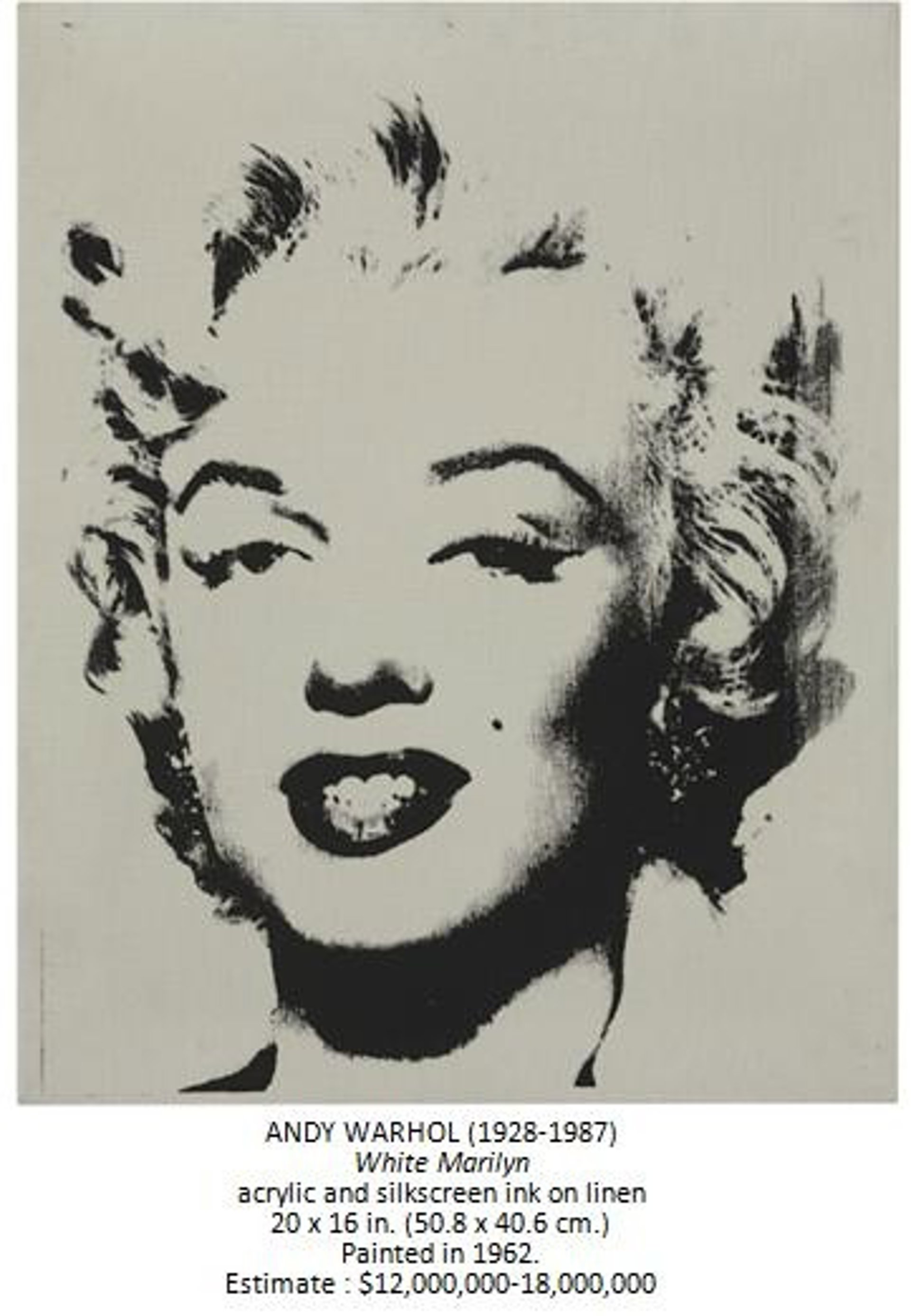 La 'Marilyn blanca' del artista estadounidense Andy Warhol será una de las obras que saldrán a la venta en la próxima subasta de Arte de posguerra y Arte Contemporáneo que celebrará la casa de apuestas Christie's el próximo 13 de mayo.