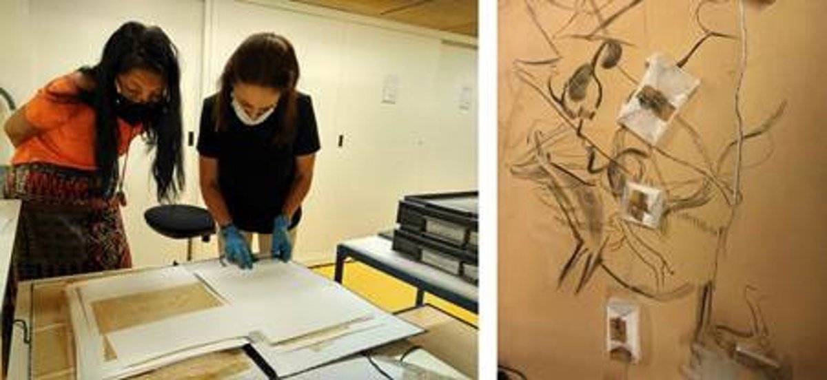 A la izquierda, las conservadoras Begoña Sánchez Chillón y Mónica Vergés Alonso cotejando los calcos depositados en el MAN. A la derecha, uno de los calcos recuperados correspondiente a los grabados de la Peña de San Román de Candamo (Asturias). - MNCN