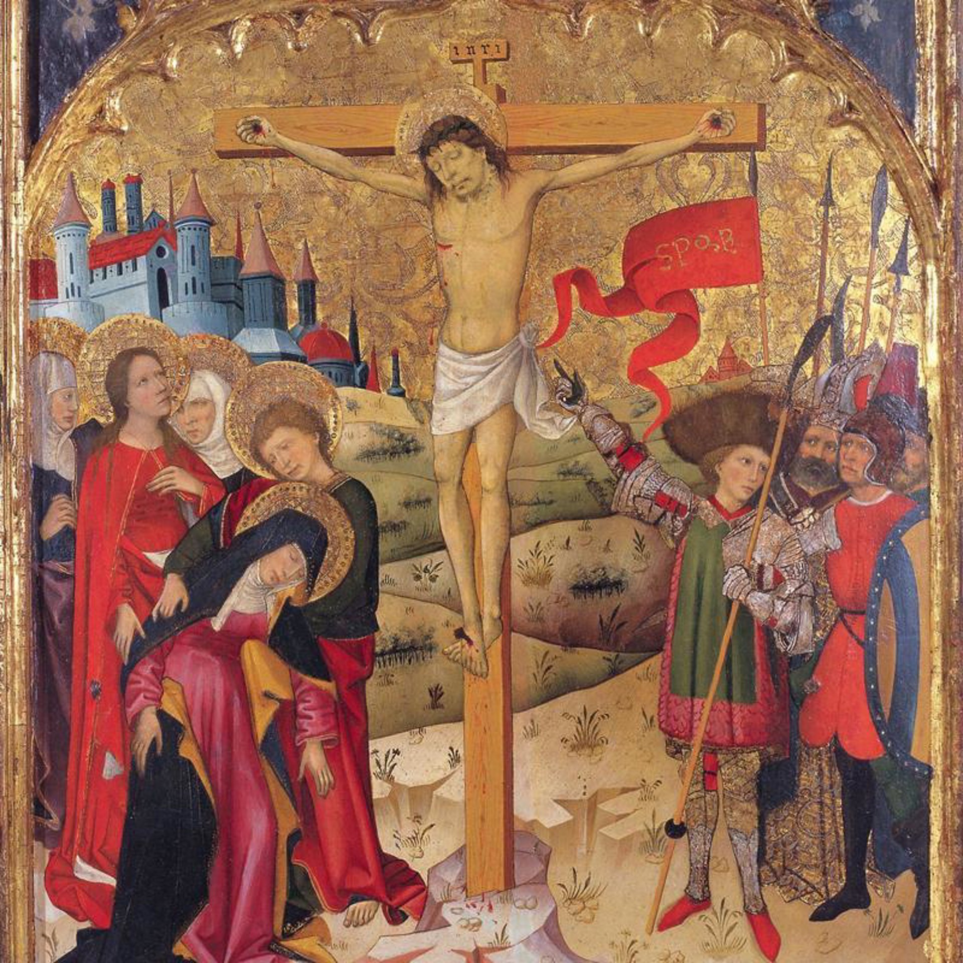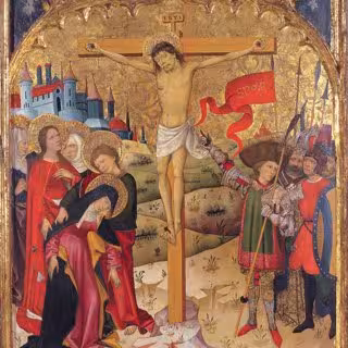 La tabla, de 96 x 77 centímetros, es la mayor del retablo y se atribuye a los pintores Joan Antigó y Honorat Borrassà, "aunque podría ser de un tercer pintor" de esa misma escuela gerundense del gótico internacional, como indicó hoy el jefe de la colección de gótico del MNAC, Rafael Cornudella, quien destacó que "no se han conservado muchas obras de esta escuela", por lo que este 'Calvario' tiene aún más valor e interés artístico.