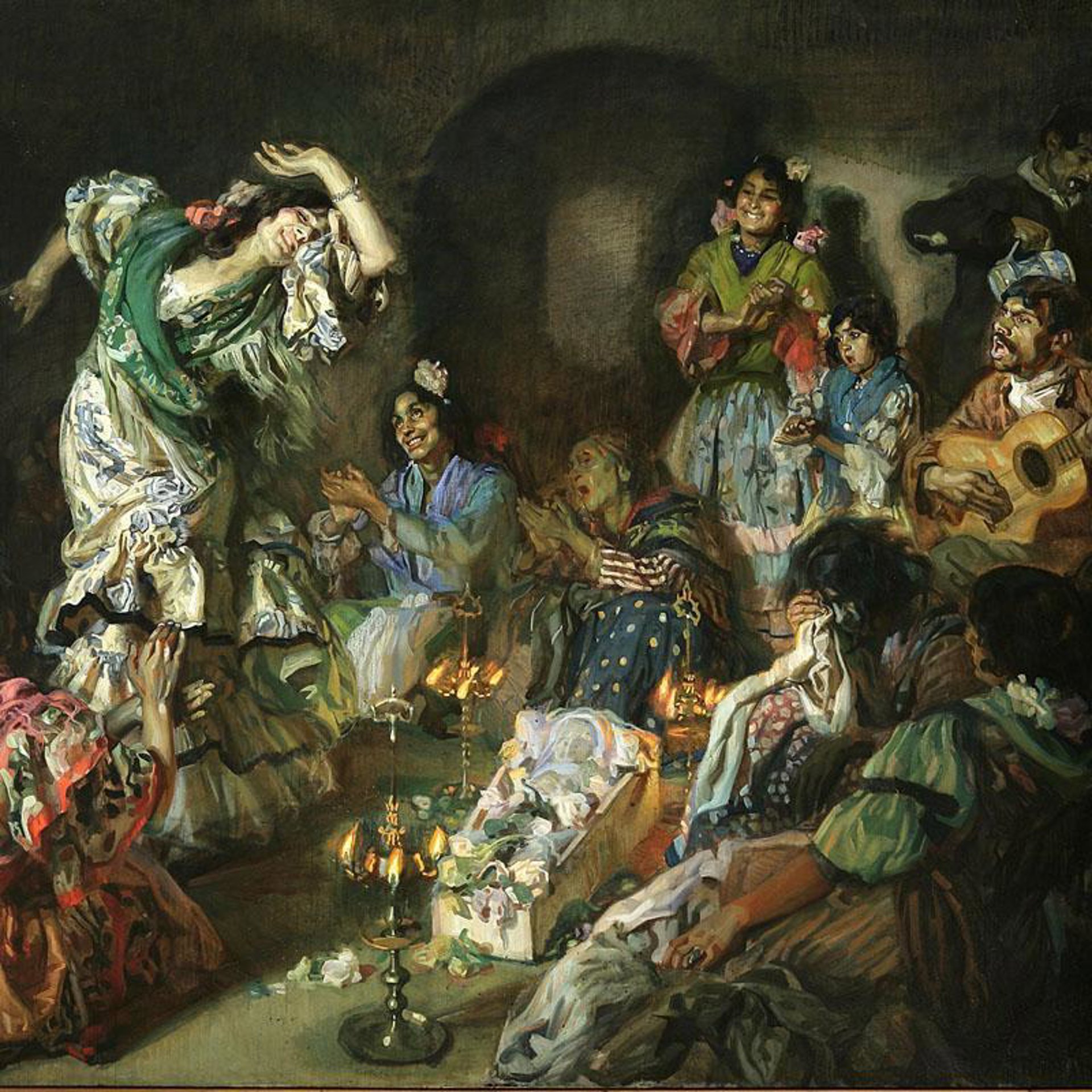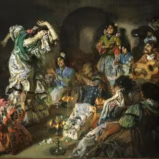 Uno de los primeros cuadros con los que Mezquita obtuvo un reconocimiento oficial --explicó Javier Rojas-- fue 'Cuerda de Presos' que le valió una medalla en la Exposición Nacional de 1901, "apenas cumplidos los 18 años". En un principio, parece que se puede enmarcar a Mezquita "dentro de una línea pictórica tradicional" pero si se le observa con detención, se encuentra que emplea "técnicas propias de la pintura moderna". Algunas de las obras se exponen por primera vez en España como 'La juerga', procedente del Museo de Lieja.