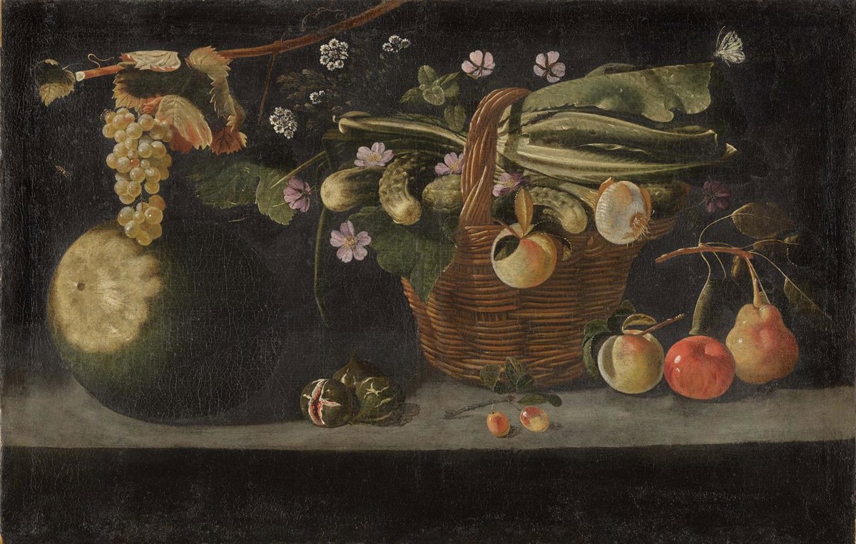 El cuadro de Ayala presenta una serie de frutas, verduras y flores dispuestas sobre una repisa oscura, un recurso habitual entre los pintores de bodegones activos en Iberia, como Juan Sánchez Cotán y Juan van der Hamen. Algunas de las frutas y verduras que incluye Ayala tienen claras connotaciones bíblicas y cristológicas: el melón, las cebollas y los pepinos que sustentaron a los israelitas en el desierto; la manzana que hace su fatídica aparición en el Libro del Génesis; y las uvas maduras con las que se elabora el vino de la Eucaristía.