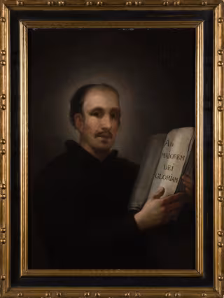 Según la catalogación realizada por el experto de Pintura Antigua de la galería, Javier Lopez Serrano, viste el hábito de la orden y en sus manos porta un libro con una inscripción: "ad maiorem dei gloriam" ("a la mayor gloria de Dios").