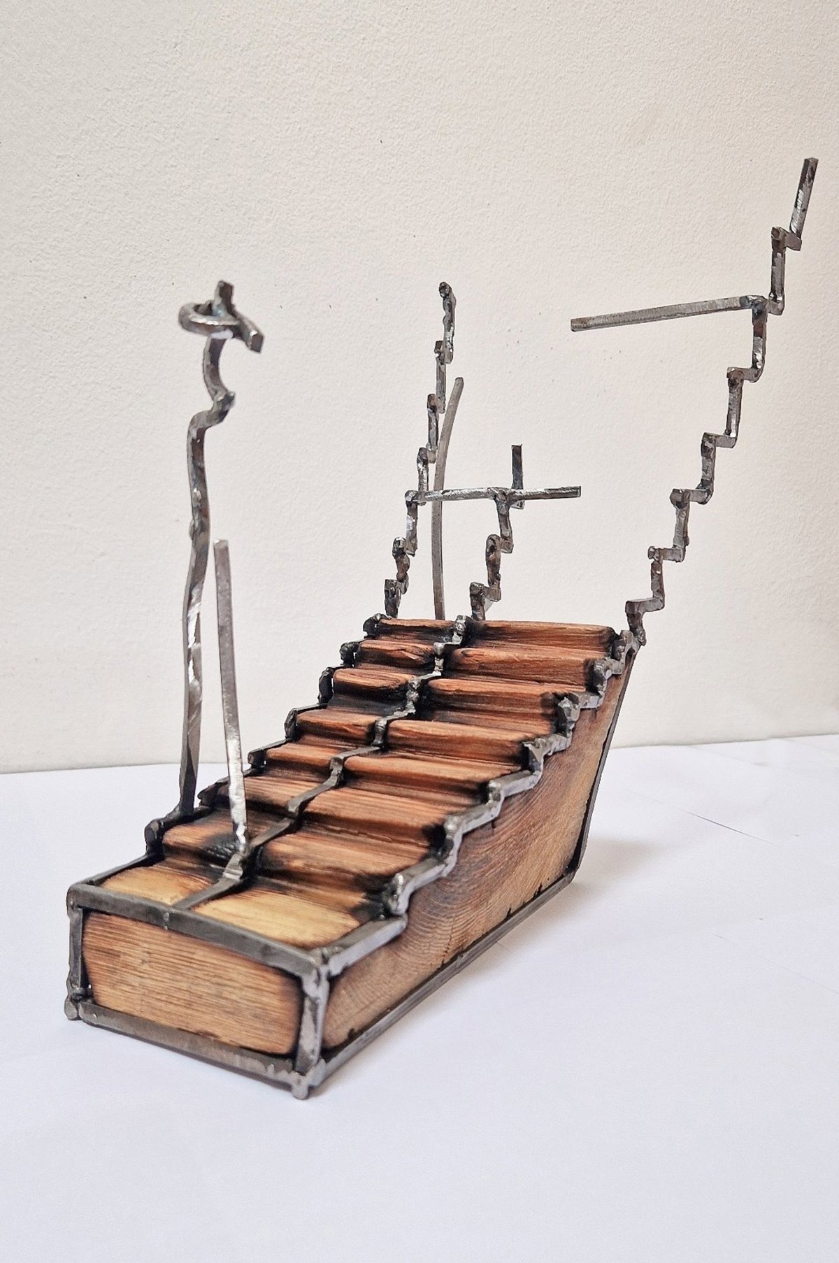 El diseño de este premio nació en el taller como un diálogo entre materiales y memoria. La madera sostiene una escalera de acero que asciende de manera irregular, como los caminos vitales que nunca son rectos.