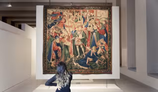 La arquitecta y youtuber Ter contempla el tapiz El triunfo del tiempo. - PATRIMONIO NACIONAL