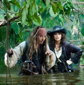Precisamente ellos dos son los protagonistas de esta imagen en la que aparecen perfectamente caracterizados en medio de la selva y con el agua por la cintura. Un instante de su búsqueda de la legendaria Fuente de la Juventud, el tesoro que intentará encontrar Sparrow en su cuarta entrega que en esta ocasión dirige Rob Marshall, que ya trabajó con Cruz en el musical 'Nine'.