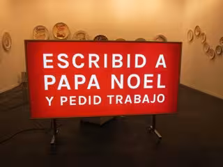 Una de ellas podría ser la apuesta del artista finlandés Riiko Sakkinen (de la galería Korjaamo), quien reside desde hace diez años en España y presenta una serie de obras reivindicativas lideradas por un cartel luminoso de grandes dimensiones en el que se lee: "Escribid a Papa Noel y pedid trabajo".
