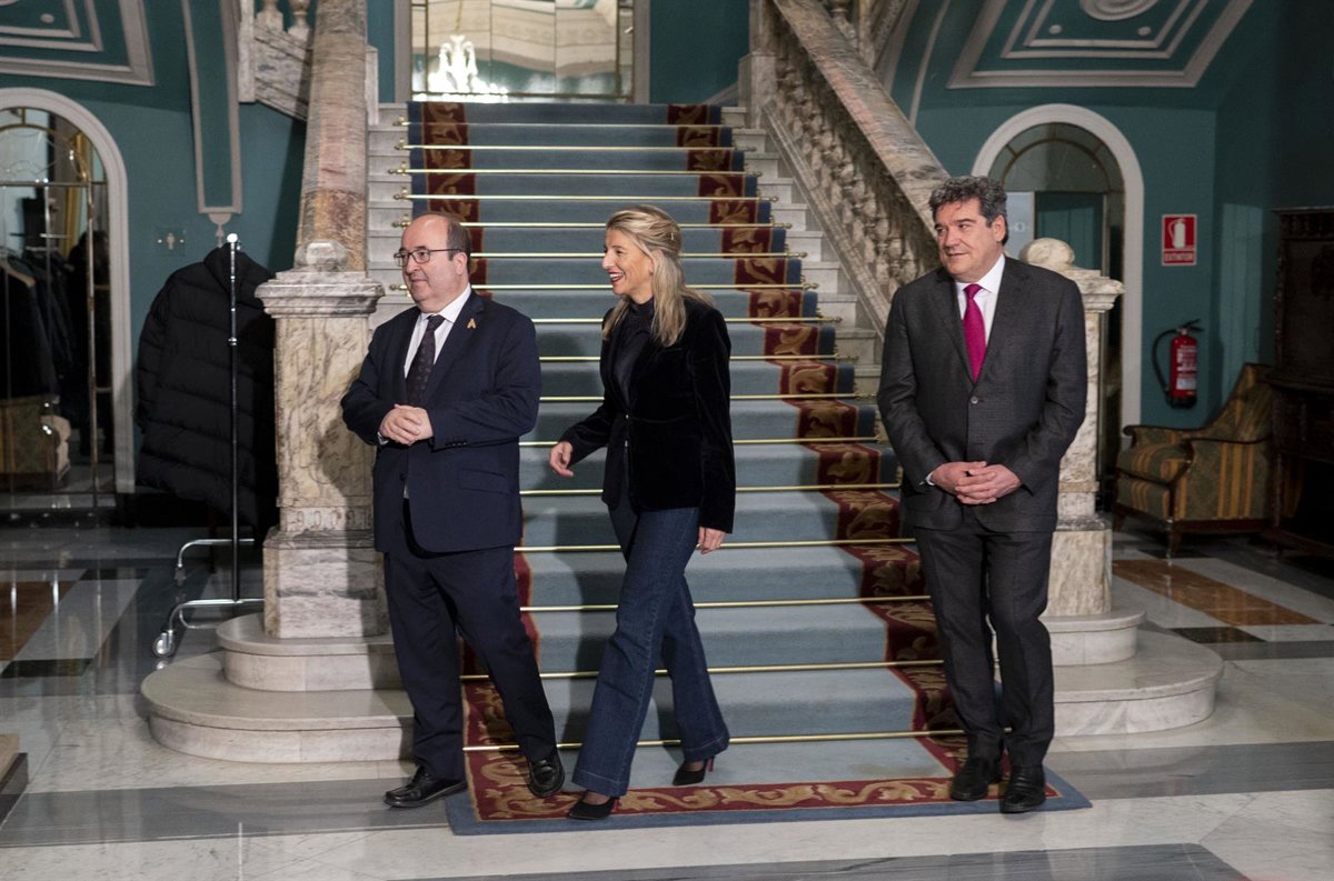 (I-D) El ministro de Cultura y Deporte, Miquel Iceta; la vicepresidenta segunda del Gobierno, Yolanda Díaz, y el ministro de Inclusión, Seguridad Social y Migraciones, José Luis Escrivá, en un diálogo abierto con el sector artístico - Alberto Ortega - Europa Press
