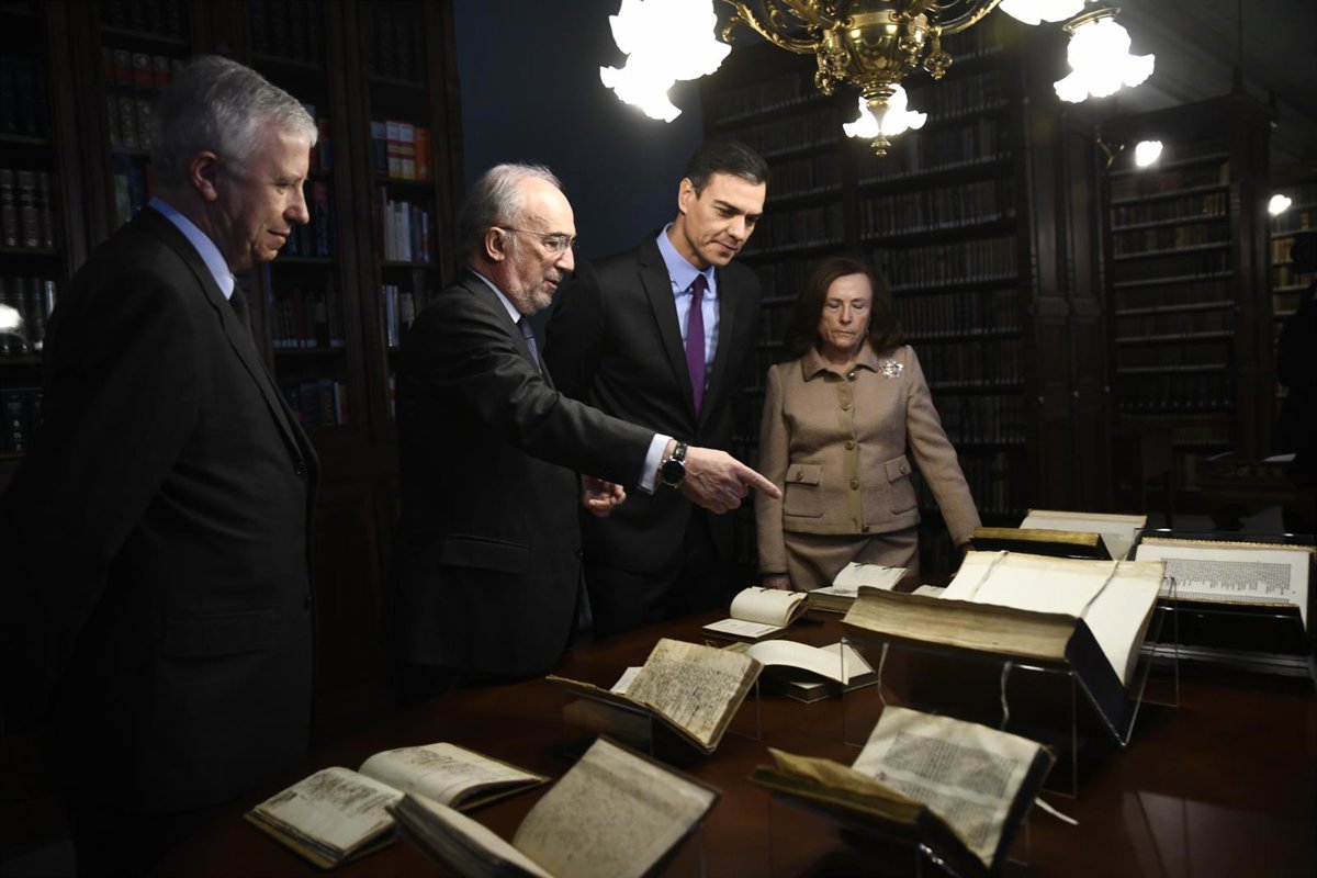El presidente de la Real Academia Española Santiago Muñoz Machado enseña algunos de los ejemplares que componen la biblioteca de la institución al presidente de Gobierno, Pedro Sánchez, en un acto de hace un año - Oscar del Pozo - Europa Press - Archivo