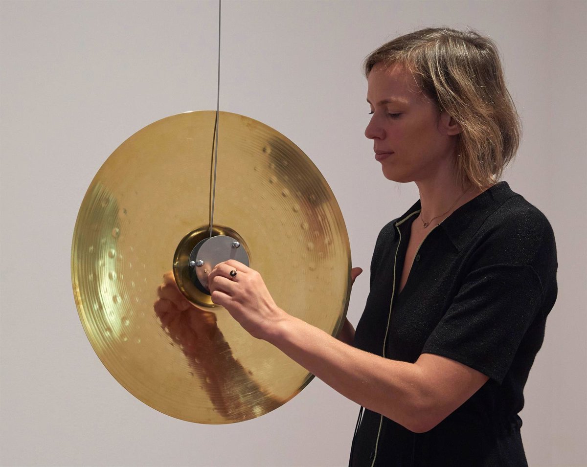 La artista Leonor Serrano activa una de las cajas de música colocadas de los platillos suspendidos que forman parte de su muestra 'Magia natural' en el Reina Sofía - MUSEO REINA SOFÍA