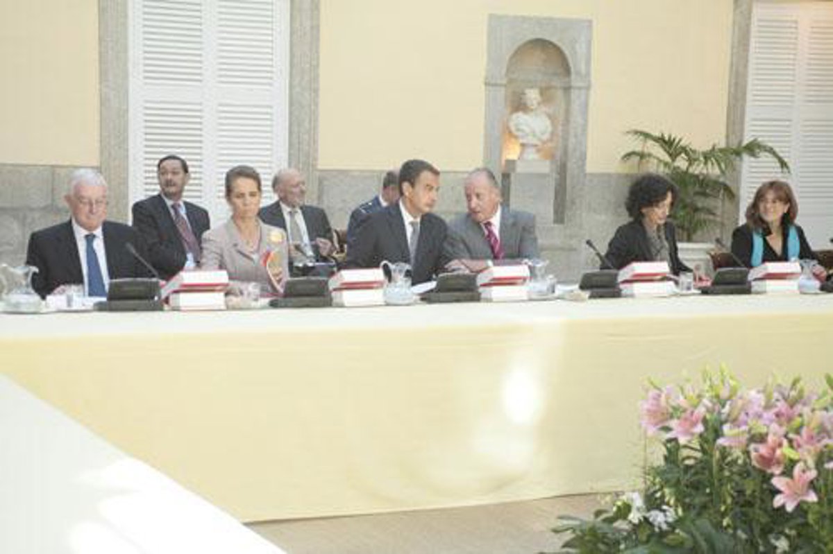 Los Reyes presidieron hoy la reunión anual del Patronato del Instituto Cervantes en un solemne acto celebrado en el palacio de El Pardo al que asistieron también la Infanta Elena; el presidente del Gobierno, José Luis Rodríguez Zapatero; el ministro de Cultura, César Antonio Molina; la ministra de Educación, Mercedes Cabrera y la directora del Cervantes, Carmen Caffarel además de los patronos de la institución entre los que estaba ausente Francisco Ayala.