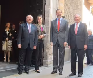 La presidenta de Aragón, Luisa Fernanda Rudi, el presidente de la Fundación Ibercaja, Amado Franco, y el director de la Real Sociedad Económica Aragonesa de Amigos del País, Honorio Romero, han recibido a Sus Majestades en la entrada del museo y les han acompañado en su recorrido a la muestra, junto a la comisaria de la exposición, Manuela Mena, que ha explicado a los Reyes las obras del pintor universal.