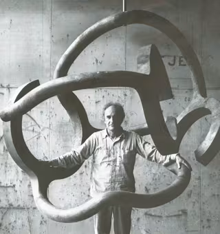 Eduardo Chillida (1924-2002) comenzó su carrera profesional como portero de fútbol en la Real Sociedad, pero dejó el deporte debido a una lesión. Su acercamiento al mundo de arte se produjo a través de los estudios de Arquitectura en la Universidad de Madrid, hasta llegar a su inmersión completa en el Círculo de Bellas Artes, donde se dedicó exclusivamente al dibujo y a la arquitectura. Su traslado a París fue el empujón decisivo para dar salida a su actividad creadora, inspirado por la arquitectura griega clásica del Louvre.