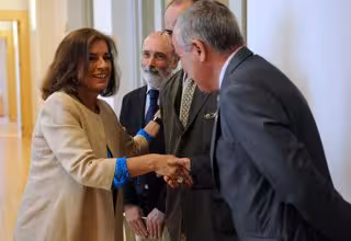 Dar con el creador del Quijote ha reunido en el Palacio de Cibeles a más de un centenar de periodistas de todo el mundo. También han querido mostrar su apoyo al proyecto el alcalde de Alcalá de Henares, Javier Bello, y la alcaldesa de Esquivias (Toledo), Elena Fernández de Velasco.