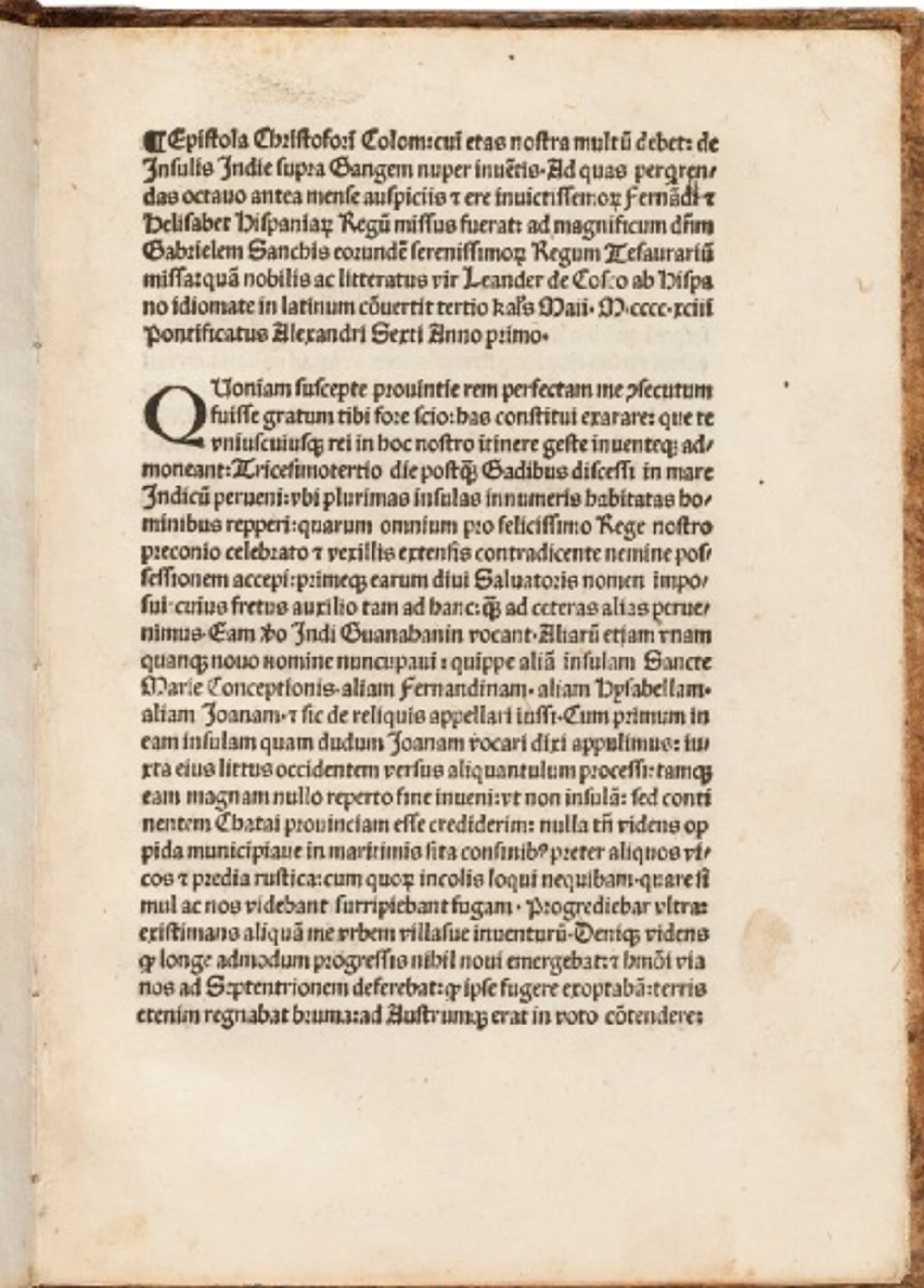 En ella proclamaba que había tomado "posesión" de las islas para el rey y la reina de España. Impreso en Roma unos 40 años después de la comercialización de la imprenta, la traducción latina del documento (que incluye un párrafo introductorio que promociona a Colón como un hombre "con quien nuestra época tiene una gran deuda") ayudó a difundir la noticia del viaje por toda Europa.