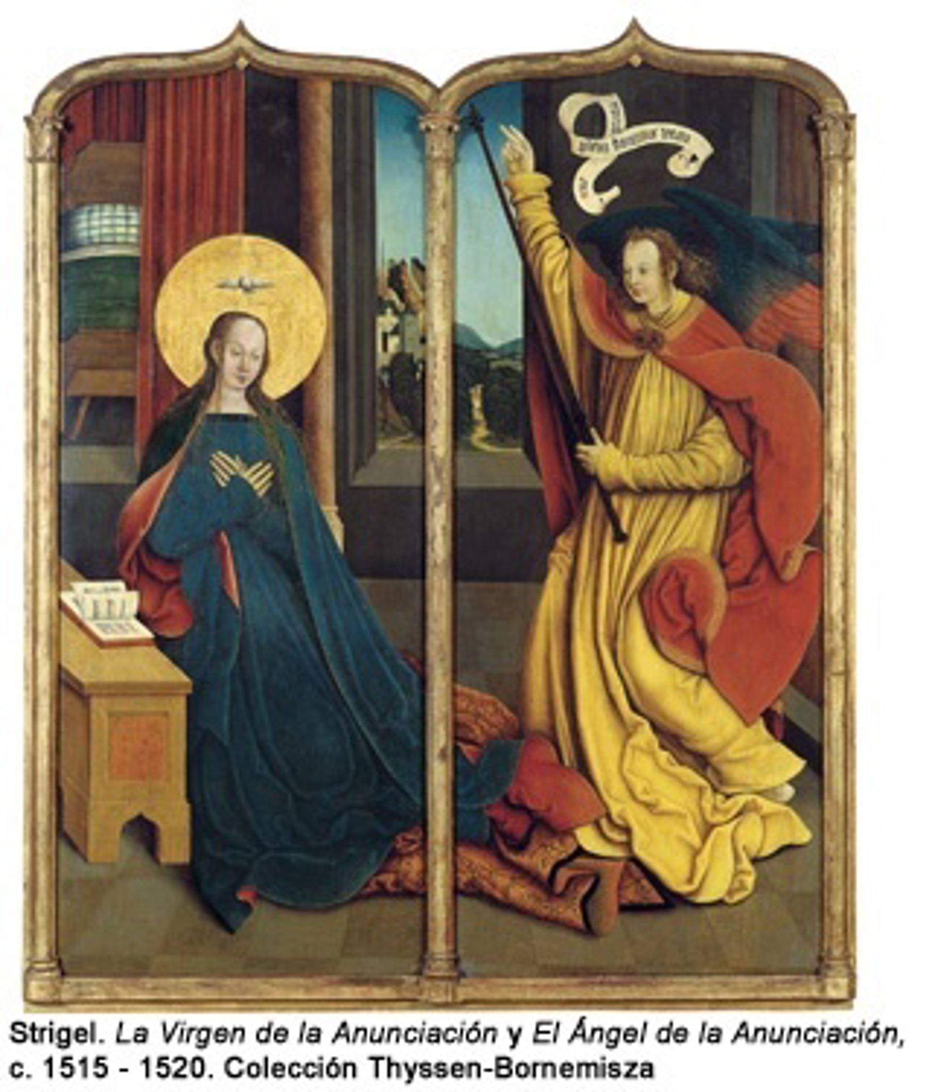 La Anunciación de Bernhard Strigel está formada por dos tablas (c. 1515-1520), unidas en el centro por una columna. En el reverso, unas tallas policromadas representan a los santos ermitaños San Pablo y San Antonio, atribuidos a Christoph Scheller y que han sido restaurados expresamente para esta presentación.