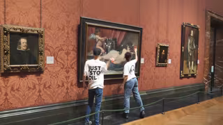 Los dos activistas atacando 'La Venus del Espejo' de Velázquez el pasado 6 de noviembre de 2023. - Just Stop Oil/PA Media/dpa