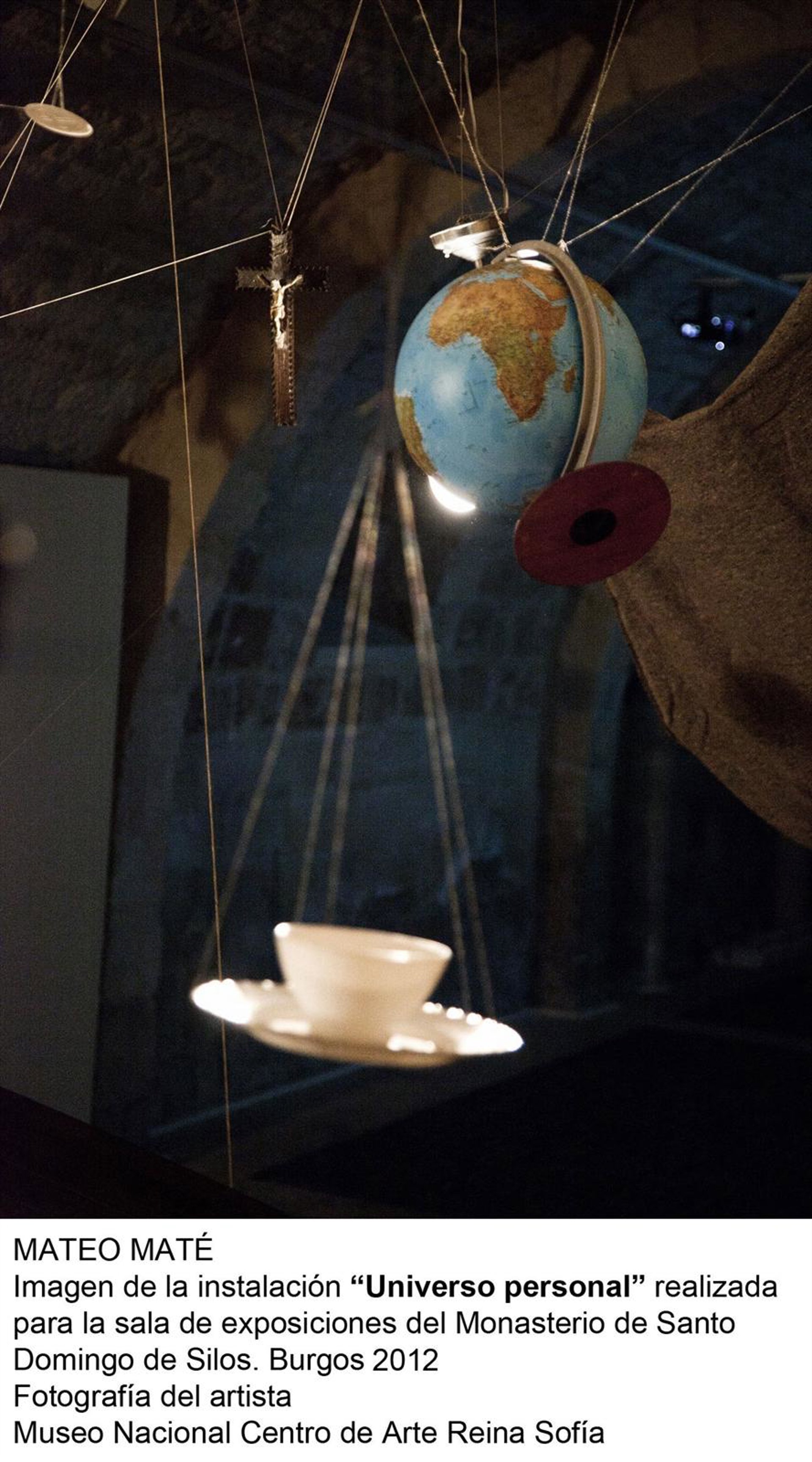 El artista madrileño Mateo Maté ha concebido una obra expresamente para el espacio expositivo de la Abadía de Santo Domingo de Silos. El montaje, enmarcado dentro de la programación del Museo Reina Sofía, permite al visitante sentirse dentro de una nave para acercarse a las piezas, viajar entre unas y otras y observar cómo flotan.