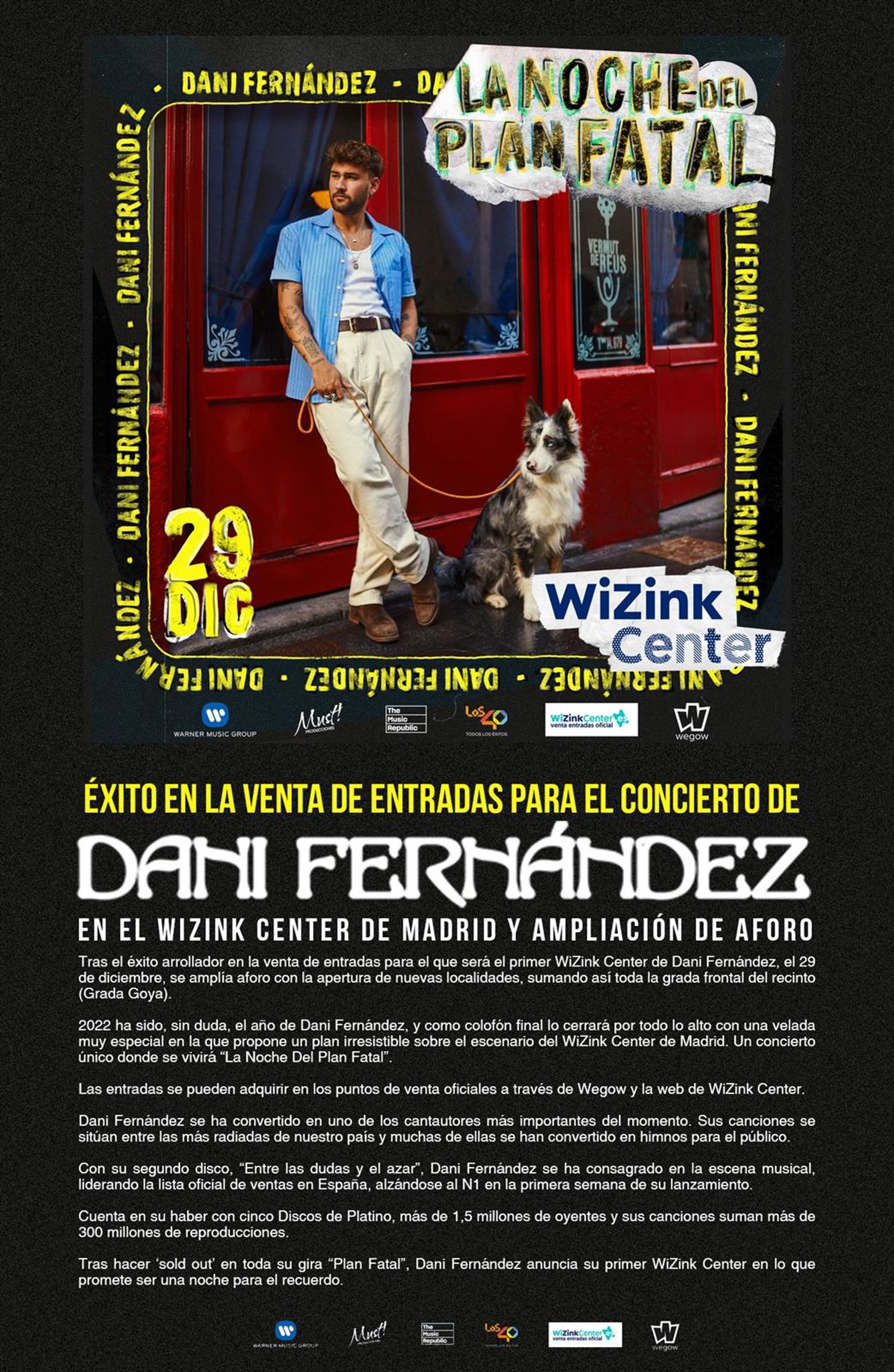 El WiZink Center de Madrid ha decidido ampliar su aforo para el concierto de Dani Fernández, el próximo 29 de diciembre, con la apertura de la grada frontal del recinto (Grada Goya), tras anunciarse hace una semana la celebración de 'La noche del Plan Fatal', según la productora del concierto, Must Producciones .