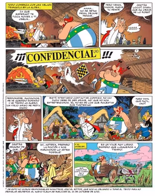 En esta tira se ve cómo Astérix y Obélix se preparan para realizar un nuevo viaje, tal y como lo confirma el druida. Mientras se disputa una partida de ajedrez galo, Panorámix, que se ha quedado medio dormido, se despierta gritando '¡CONFIDENCIAL!' "¿Quién ha alterado así su sueño y por qué la urgencia de ir a ayudar a un misterioso personaje?", pregunta la editorial.