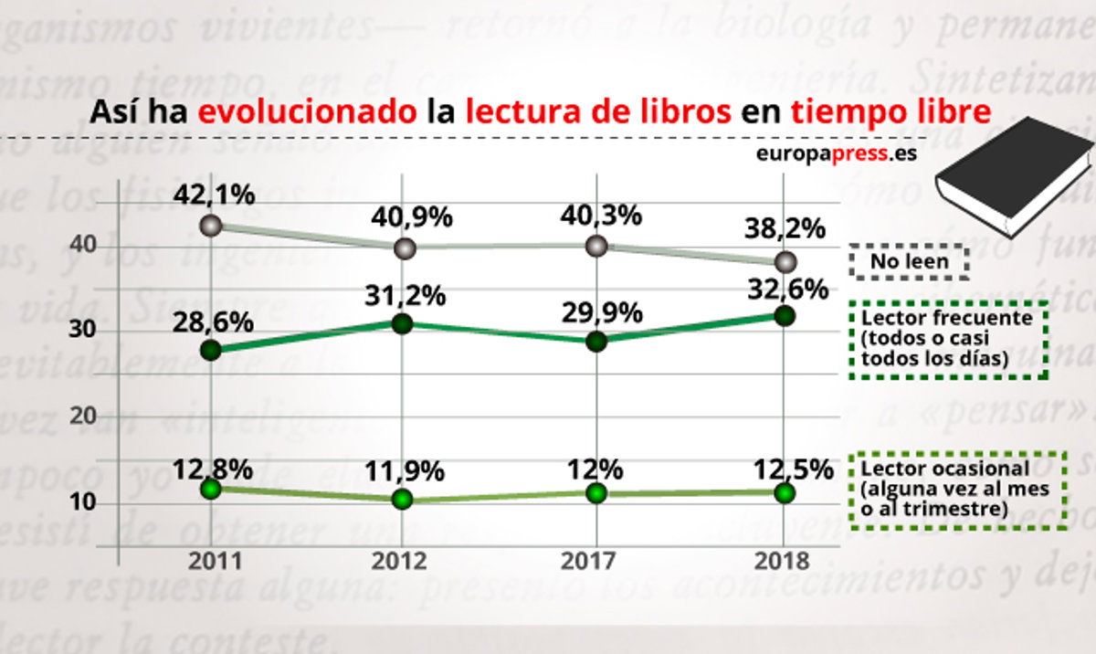 Dentro de los datos facilitados, el 49,3% de la población son lectores frecuentes y un 12,5% son ocasionales. Según el estudio, la falta de tiempo sigue siendo el principal argumento de los no lectores para explicar su falta de hábito (un 49,3% de los encuestados). Además, se observa una relación directa entre el nivel de estudios finalizados y la ratio de lectores.