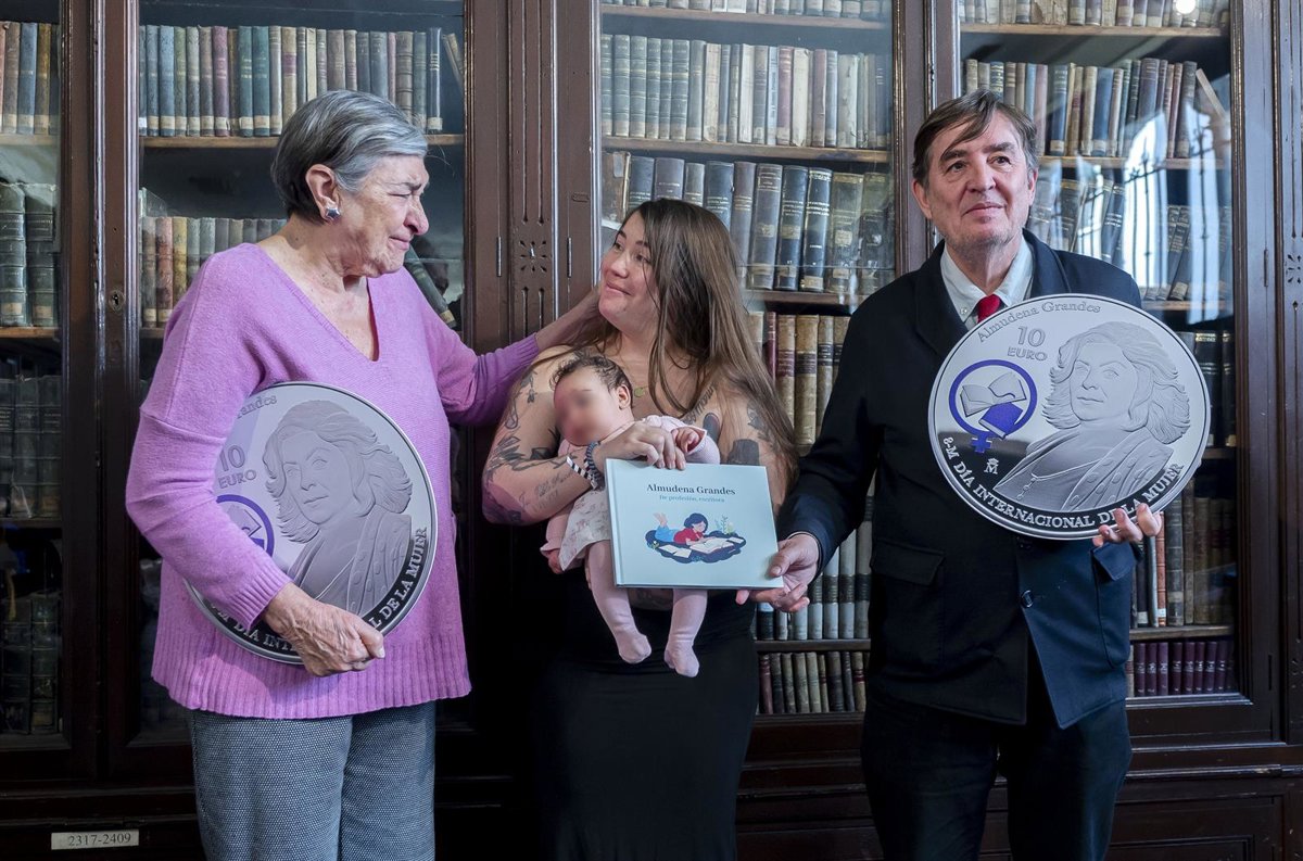 (I-D) La tía de la escritora Dolores Grandes, la hija Elisa y la nieta Candela, y el director del Instituto Cervantes, Luis García Montero, interviene durante la presentación de la Moneda 8M-2026 en homenaje a Almudena Grandes, a 19 de marzo de 2026, en M - Alberto Ortega - Europa Press