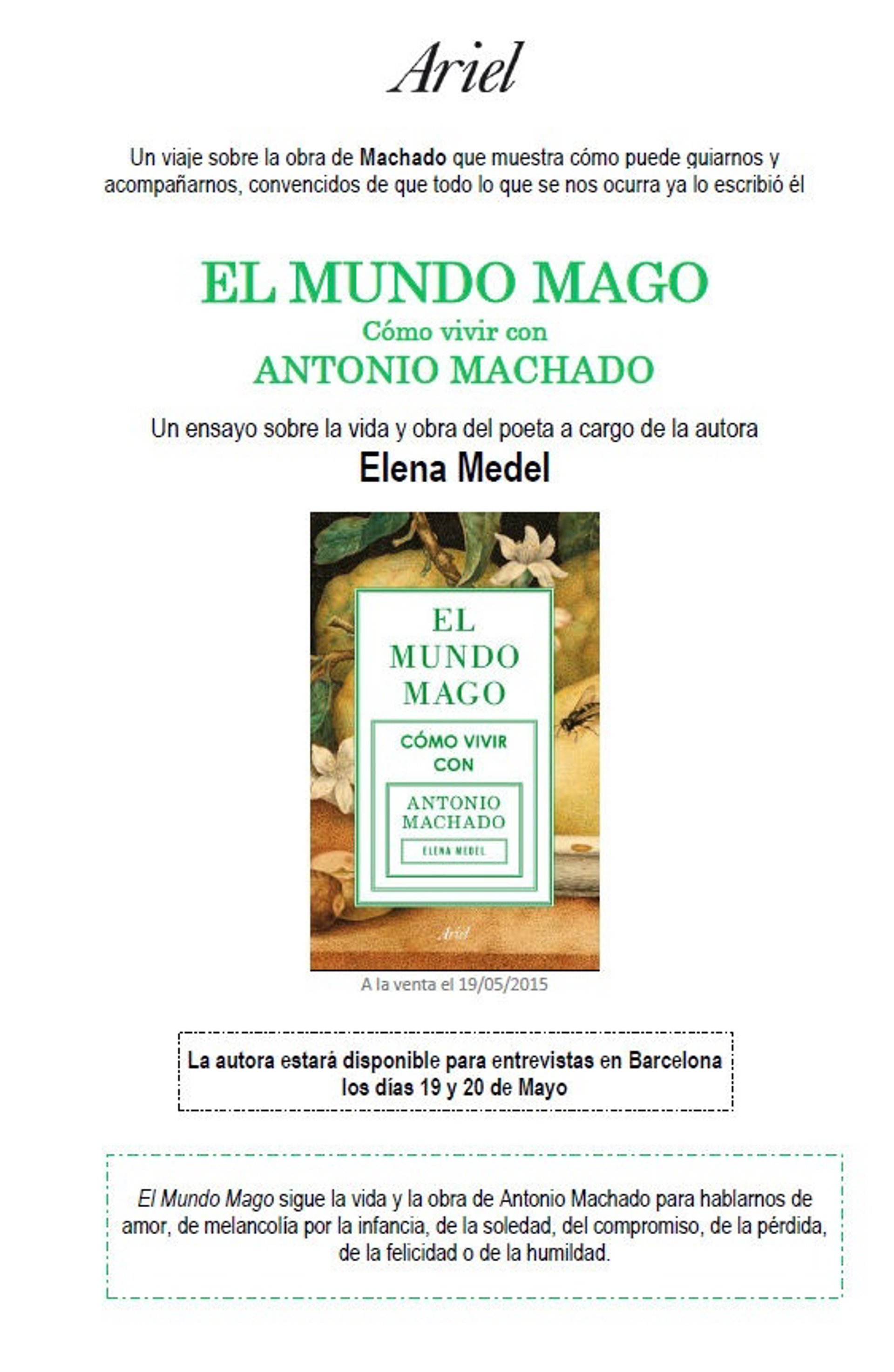 Ariel ha publicado el ensayo 'El mundo mago: Cómo vivir con Antonio Machado' de la escritora Elena Medel, en el que la autora expone en cada capítulo, de manera casi novelada, la relación de Machado con los temas relevantes en su vida y, por extensión, en su poesía, según ha informado la editorial.