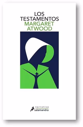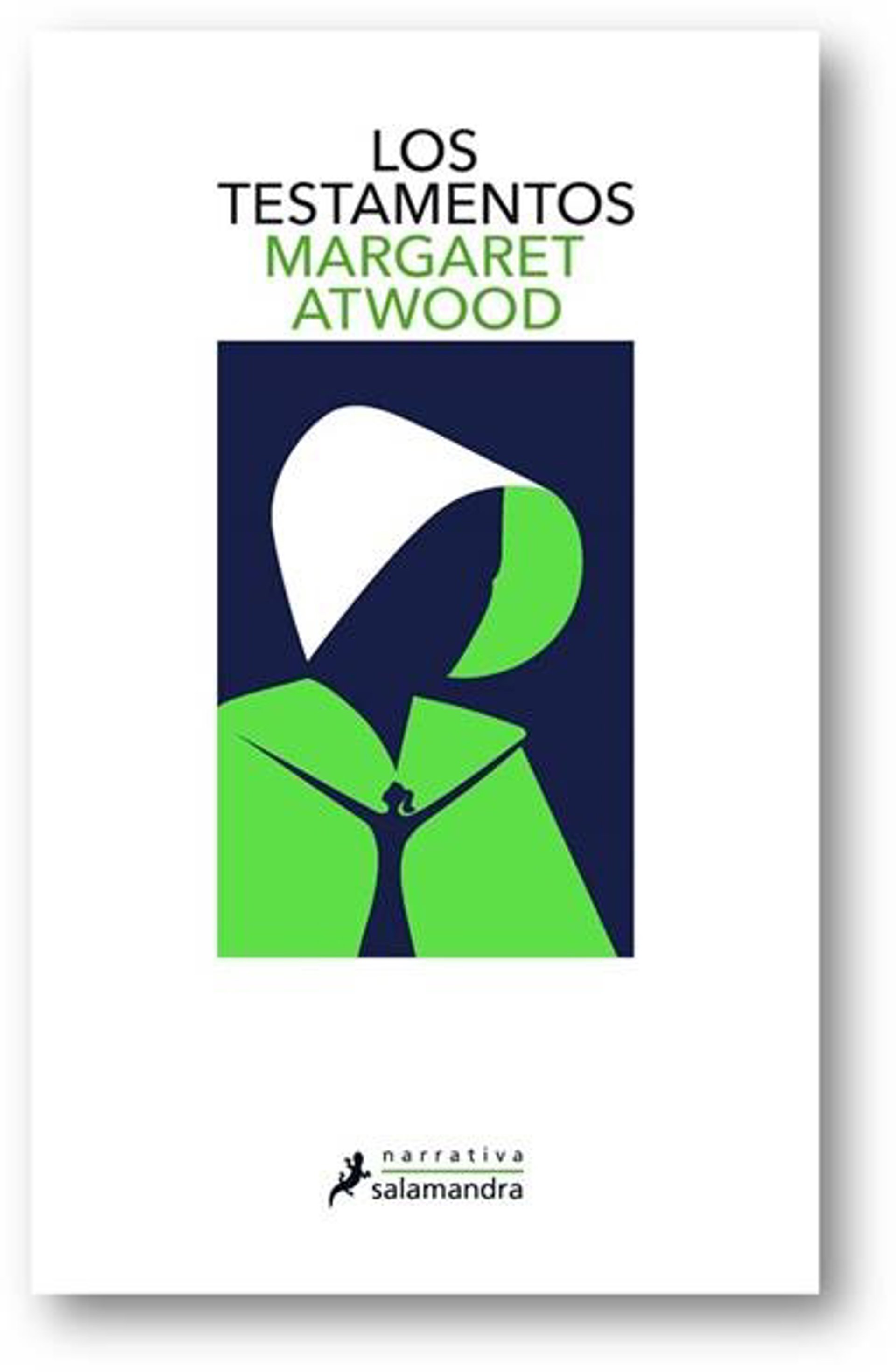 La portada de 'Los testamentos' representa a una de las mujeres de 'El cuento de la criada' con su habitual sombrero blanco y túnica, aunque, en este caso, de color verde --por el rojo de la anterior novela--.