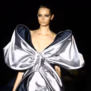 Arzuaga utiliza el vestido como prenda básica para reinventarlo con faldas de mariposa, flecos láser transparentes y estampados, pliegues, plumas de tul y raso, asimetrías volumétricas y tejidos brillantes que tan pronto adoptan forma de capa fruncida, como de arco o lazo. Éste último, es una de las principales apuestas de la colección ya que, por primera vez, deja de ser un ornamento para transformarse en un vestido que envuelve a una mujer transformada y llamativa. El lazo aparece que casi todos los vestidos ya sea a la altura de la cadera, a modo de escote, cubriendo los hombros de la modelo o la espalda de ésta, como si se tratara de la cuerda de una muñeca antigua.