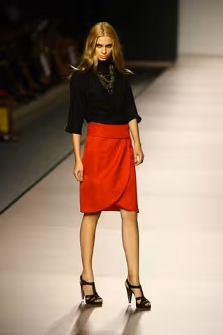 Para las faldas, el diseñador juega con distintos largos, que nunca sobrepasan la rodilla y adopta formas de globo y sarong. Schelesser elige también faldas largas con aberturas que dejan al descubierto las piernas de la mujer, también de inspiración griega.