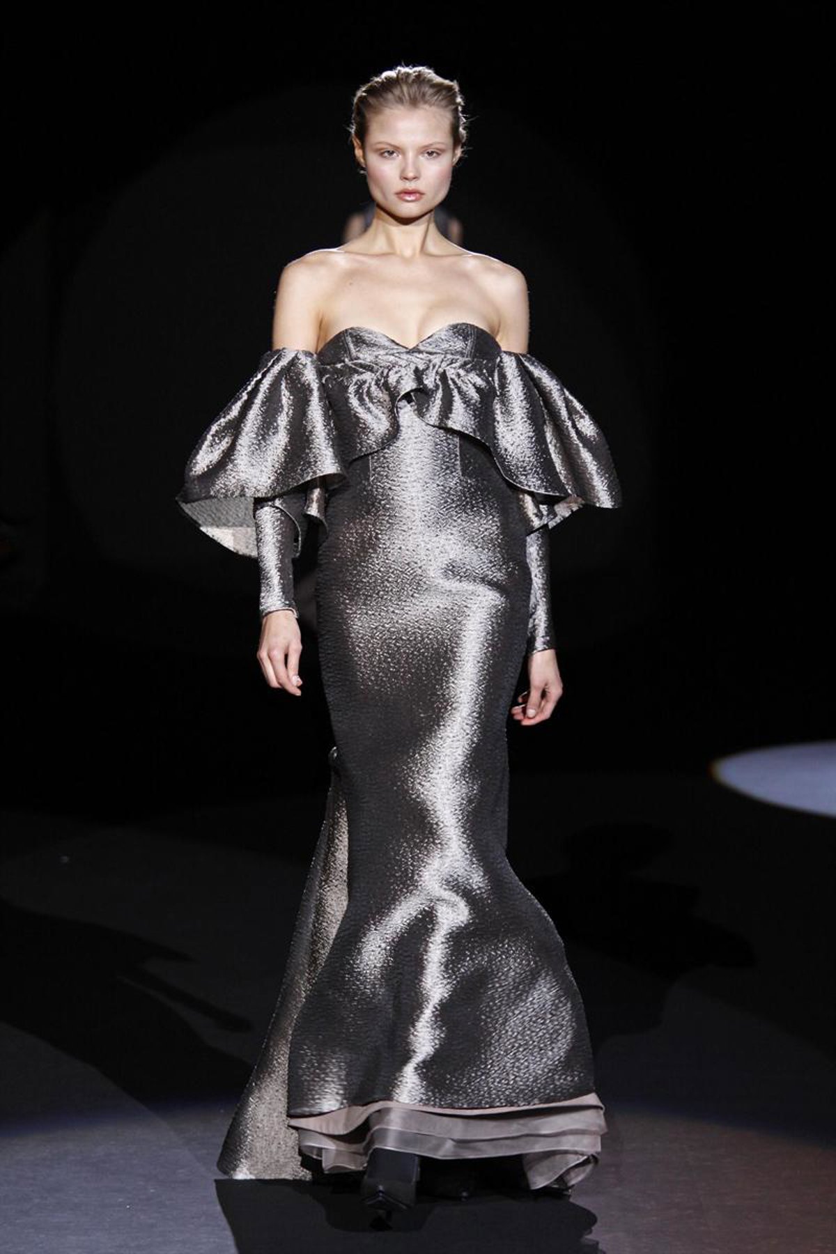 Tejidos superpuestos, seda con textura, jacquard con reflejos, encaje, ante, y un recurrente motivo floral en hilo recortado son utilizados para crear proporción. Los elementos decorativos pertenecen a detalles arquitectónicos del s. XVIII y han sido forjados en cobre para crear ciertas piezas en cinturones, zapatos y ornamentos para el pelo.