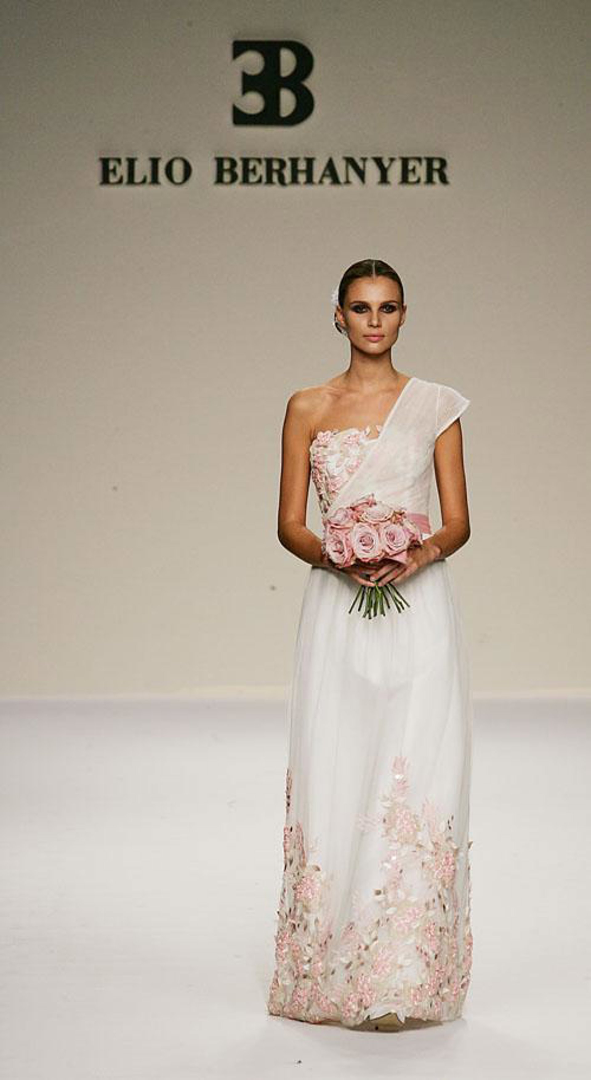 Como colofón al espectacular desfile, el andaluz presentó un vestido de novia que logró poner al público al pie. Flores rosas y discreta pedrería superpuestas en la parte alta del torso y en los bajos del vestido resaltaban discretamente entre el blanco inmaculado.