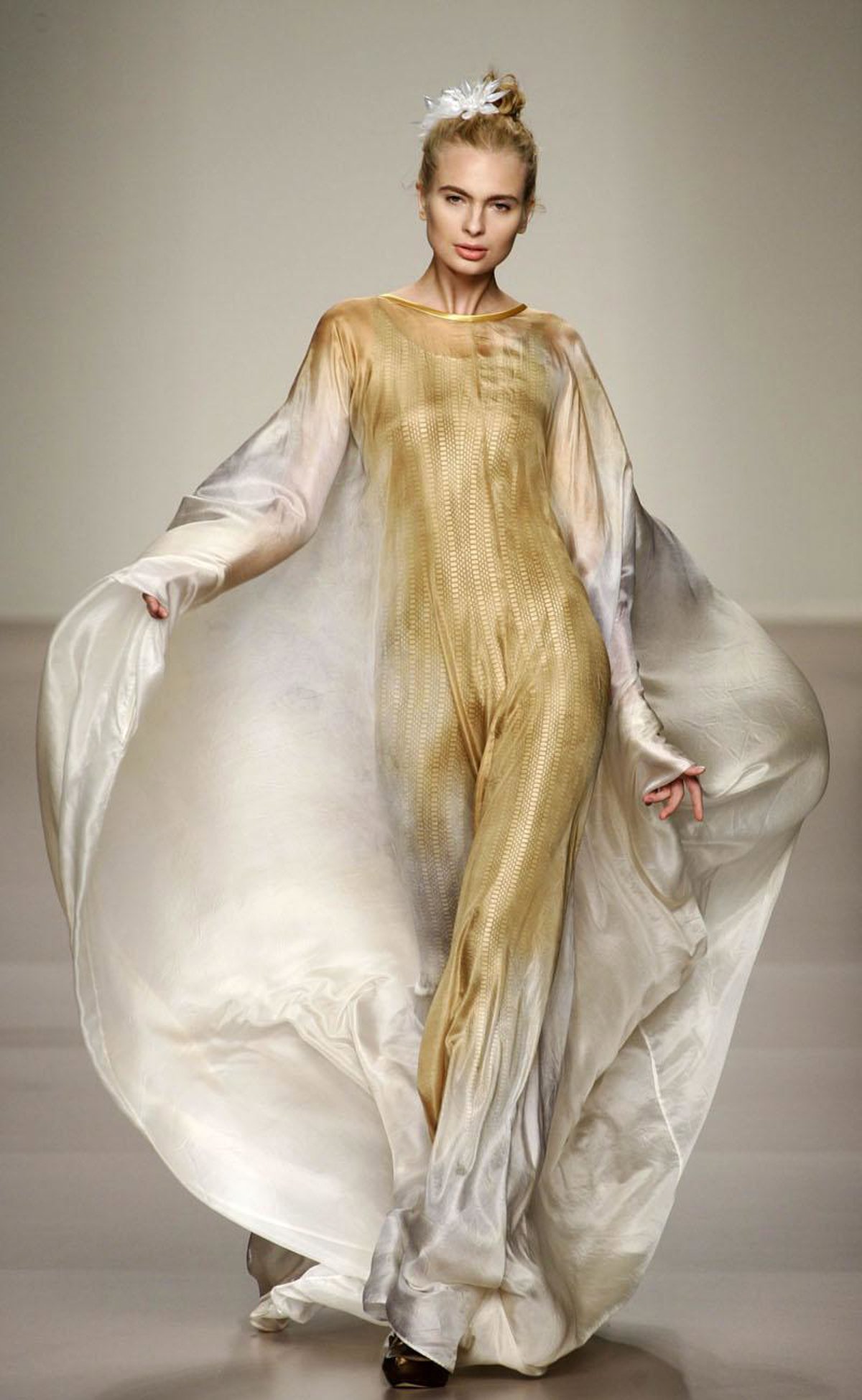 Sin embargo, fueron las túnicas las prendas que más aplausos despertaron entre el público, especialmente un modelo en seda blanca y dorada que se desliza hasta los tobillos de la mujer y deja entrever apenas sus brazos gracias a sus mangas acampanadas. El tejido se agita libre al paso de la fémina para ceñirse a sus formas de manera casual creando un efecto de movimiento constante, gracias a sus pliegues.