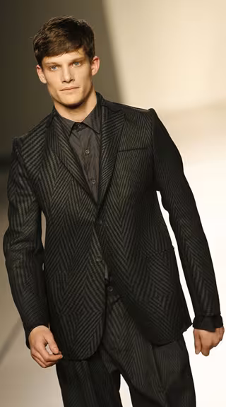 Para ello, el modisto se ha valido de colores oscuros con el negro como protagonista absoluto, acompañado por los azules marinos, los grises, los verdes salvia y los violas. La nota de color entre tan escasa gama cromática la ha puesto una chaqueta en un tono casi azul eléctrico y brillante. Los tejidos utilizados en sus creaciones han sido lana, algodón, nylon y doble faz.