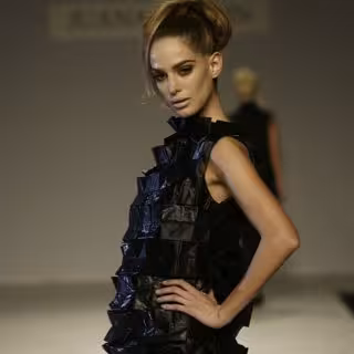 Esta creadora reinterpreta las tendencias futuristas para dar formas a pantalones pitillo y de talle alto que son acompañados por chaquetas del mismo tejido, que se ciñen a la cintura dándola forma.