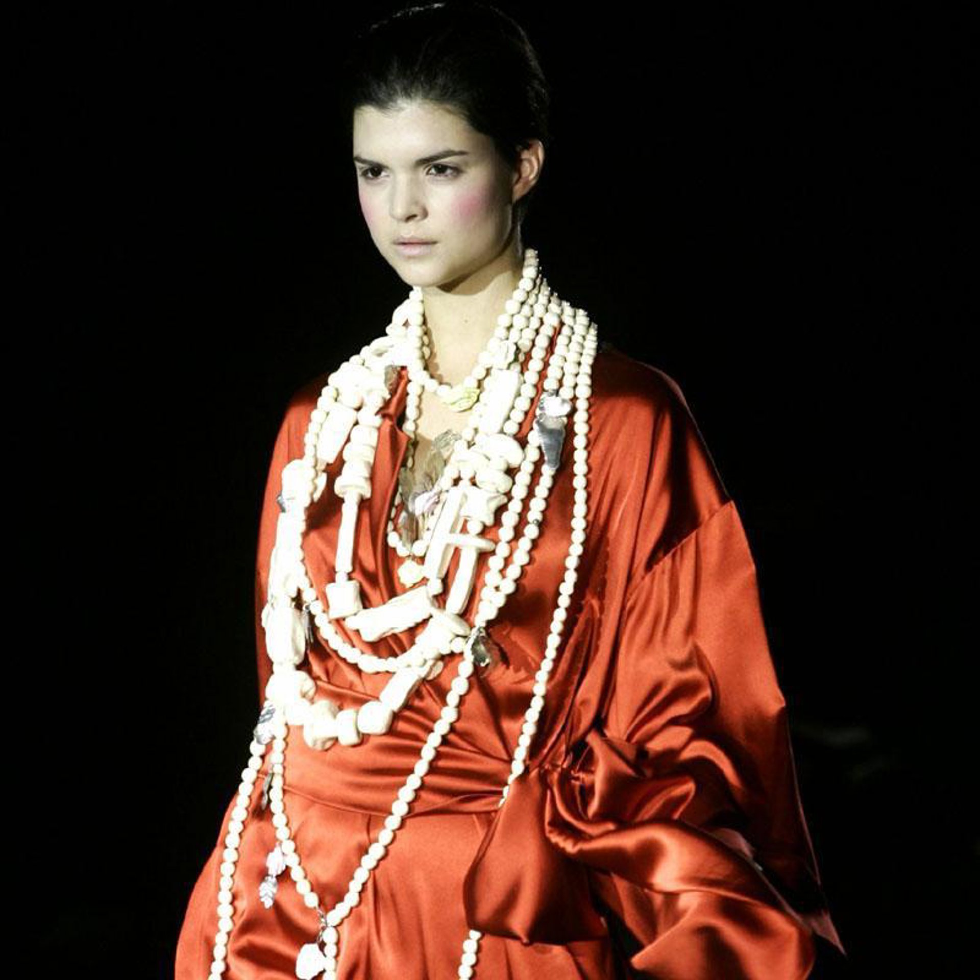 La diseñadora catalana cubre sus creaciones con minigabardinas de cuadros Gales con botones lacados, pañuelos de dibujo cupido y cascadas de porcelana inspiradas en India. Además, Delgado rompe con todos los esquemas del clasicismo complementando sus piezas con plumas, collares jirafa de cuentas de terciopelo que llegan hasta la rodilla y unos personalísimos gorros con orejas de gato que se ajustan en el cuello.