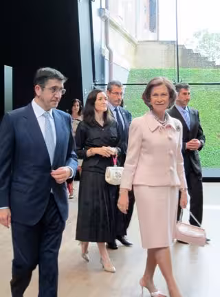 Doña Sofía, vestida con un traje de dos piezas color rosa palo, ha sido recibida por representantes del Patronato mientras el Orfeón Donostiarra interpretaba un aurresku que ha sido bailado por dos dantzaris. Tras saludar con un beso a los bailarines, la Reina ha procedido a descubrir una placa con la que se ha dado por inaugurado el museo Cristobal Balenciaga.