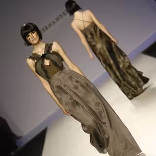 Será la noche quien vista a la mujer de esta diseñadora gallega con vestidos largos que tropiezan con el suelo. Vestidos románticos, sinuosos y vaporosos, de color gris y caqui - oro, con telas como la organza o el crespón de seda que junto a aplicaciones de plumas y piedras de cristal, marcan la silueta de la cintura y dan a la mujer el signo de lujo que necesita.