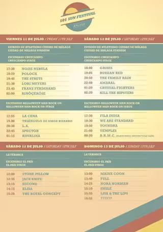 Los conciertos en La Térmica, a los que se podrá acceder con el pase del festival, comenzarán este sábado a las 12.00 horas en el escenario El País con los malagueños Stone Pillow. Posteriormente, Jack Knife, Second, Elisa y The Royal Concept irán desfilando por las tablas de La Térmica.