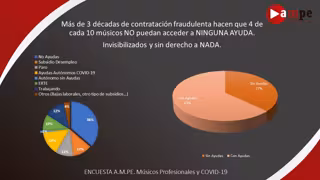En colaboración con sus diversas delegaciones, AMPE ha realizado una encuesta a 1.175 músicos sobre la situación de los profesionales del sector -que se puede consultar AQUÍ- que concluye que "el 37% de los músicos (intérpretes, ejecutantes, DJs o docentes de música) no tienen derecho a ningún tipo de ayuda".