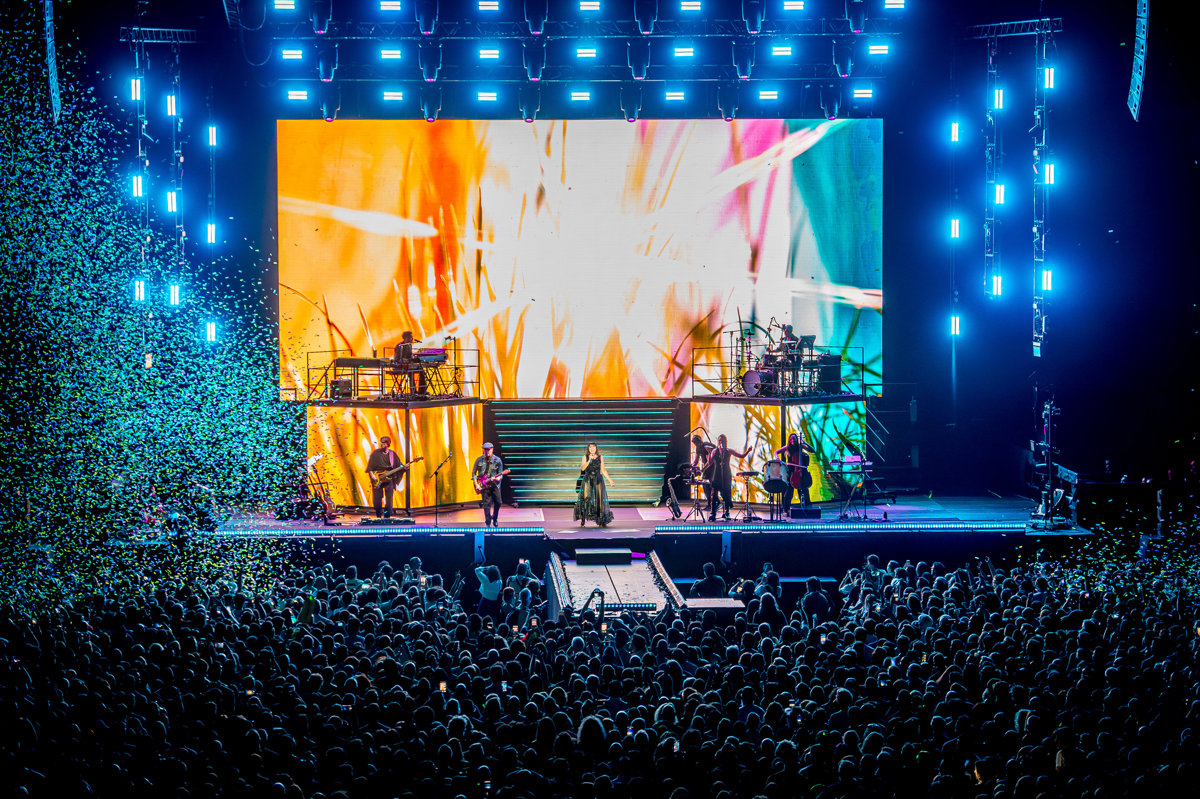 La evolución de Amaral se ha podido apreciar esta noche con un concierto lleno de ritmo y energía en el que no han faltado sorpresas visuales, como cuando Eva ha levitado sobre el escenario mientras cantaba 'En el centro de un tornado', ataviada para la ocasión con un largo vestido rojo en medio de una lluvia de confetis.