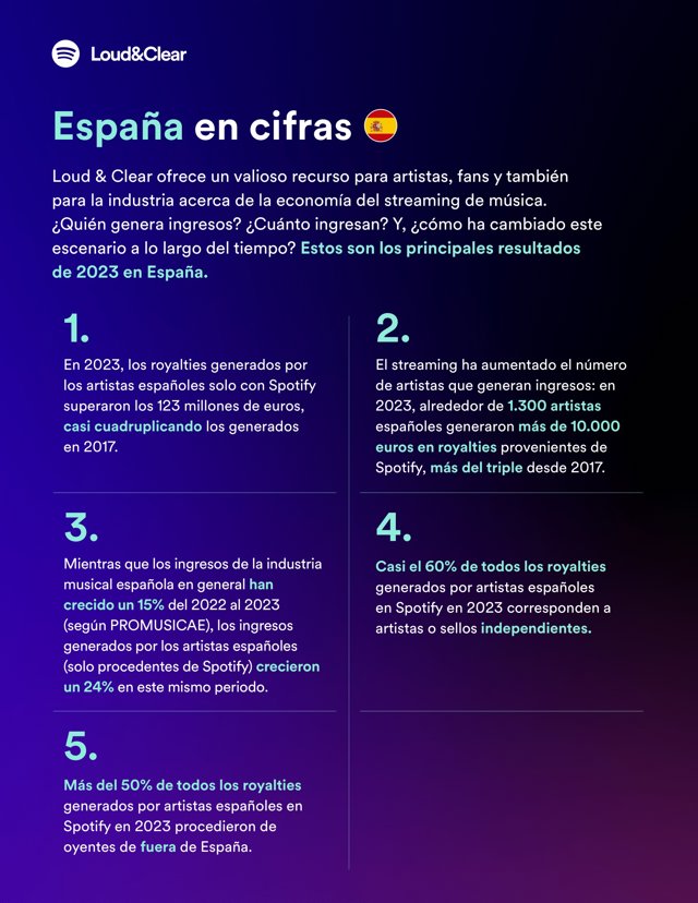 'Loud & Clear' tiene como objetivo convertirse en un recurso de información valioso para artistas, la industria musical y los fans de todo el mundo. Con 'Loud & Clear', Spotify ha revelado por primera vez los datos relativos al mercado español, su evolución y el crecimiento de los artistas españoles, cuyo éxito, audiencia e ingresos continúan creciendo, tanto en España como en el extranjero.