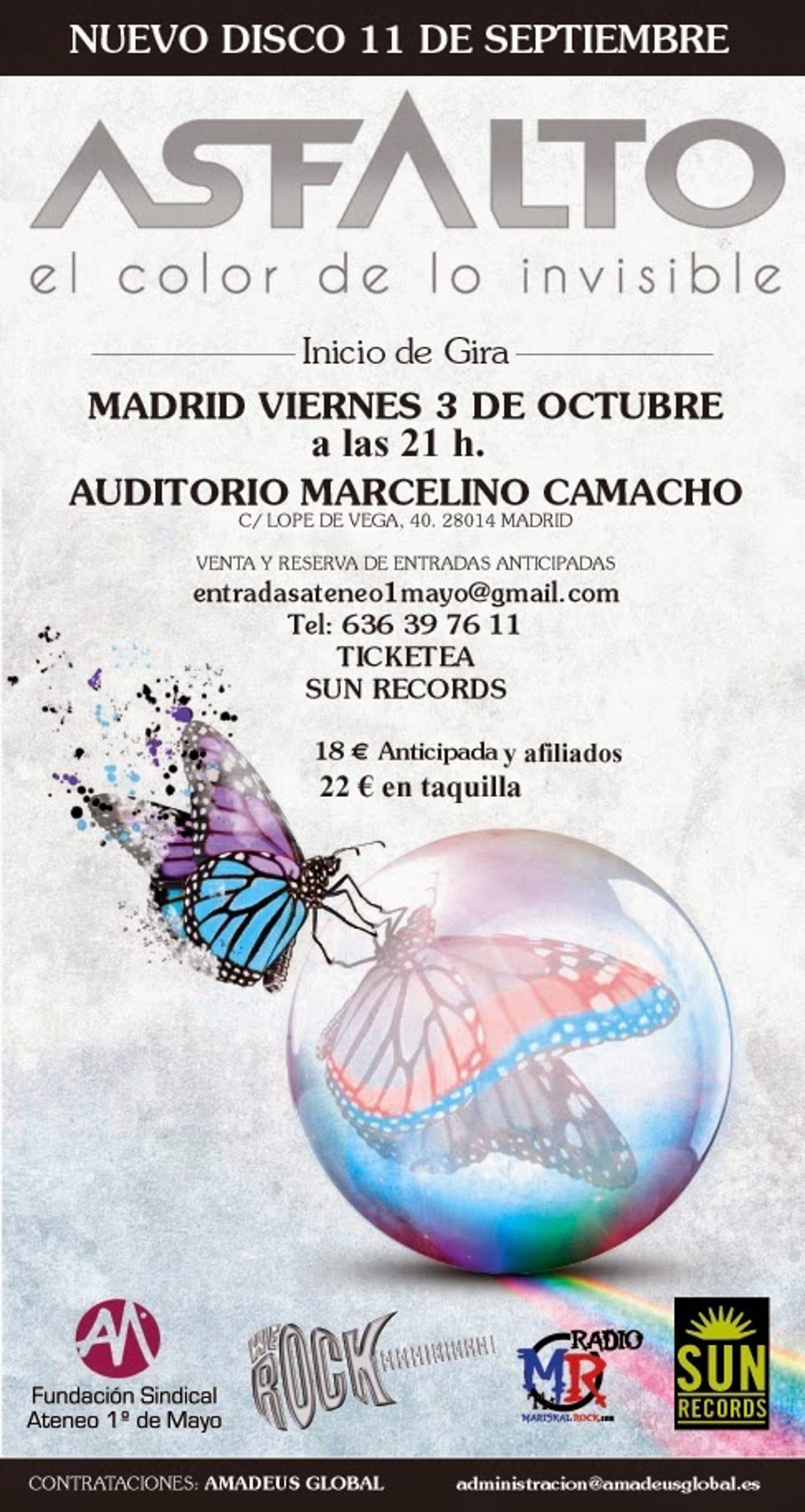 El grupo de rock Asfalto iniciará la gira de presentación de su disco 'El color de lo invisible' en el Auditorio Marcelino Camacho, una actuación que se enmarca dentro de la programación del Ateneo Cultural 1º de Mayo de CC.OO. de Madrid.
