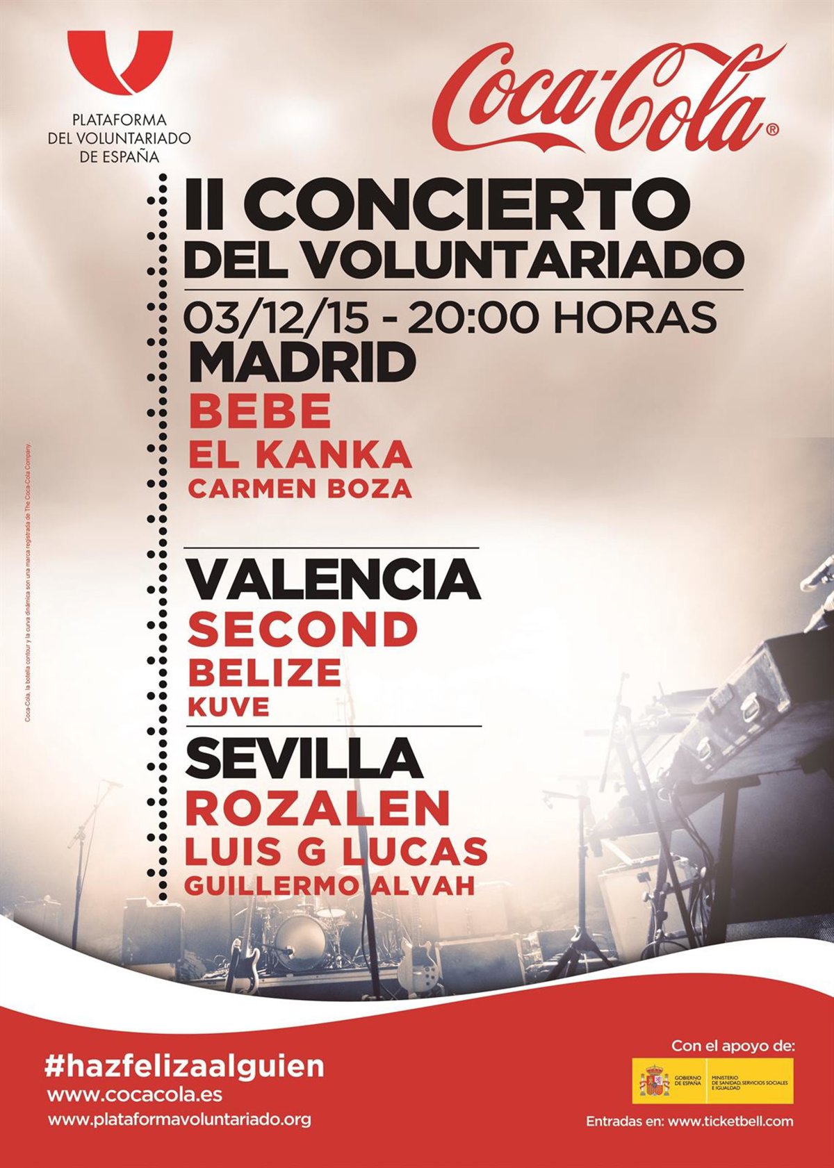 Coca-Cola y la Plataforma del Voluntariado de España han organizado el II Concierto del Voluntariado, un evento musical que se celebra este 3 de diciembre en Madrid, Valencia y Sevilla con el objetivo de impulsar el voluntariado entre los jóvenes y hacer visible los ámbitos donde ejercerlo.