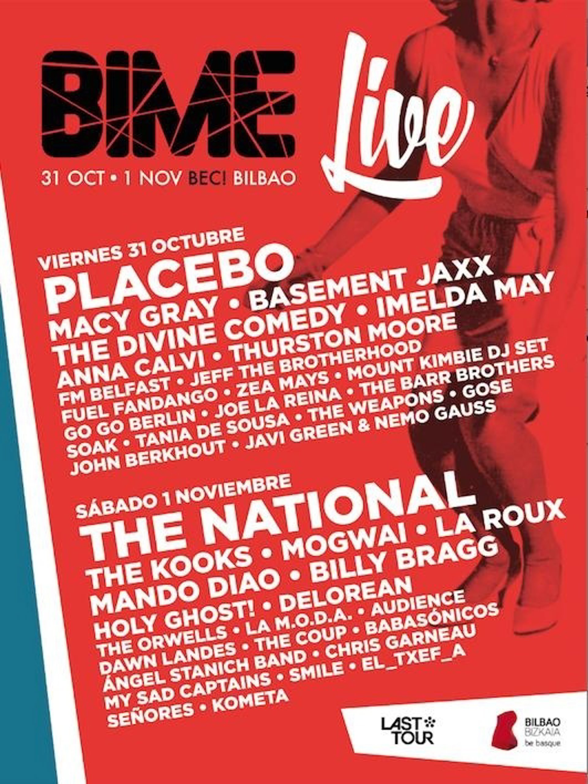 El festival BIME Live, que se celebrará lo días 31 de octubre y 1 de noviembre en el BEC! de Barakaldo (Bizkaia), en el marco de BIME Pro, feria dirigida a la industria musical y digital, ha cerrado su cartel con La Roux, Babasónicos, Mount Kimbie DJ Set, Soak, Ángel Stanich Band, El_Txef_A y Javi Green & Nemo Gauss, que se unen a nombres ya anunciados anteriormente como The National, Placebo, Macy Gray, The Kooks, Mogwai, Basement Jaxx, Mando Diao, The Divine Comedy, Imelda May o Billy Bragg, entre otros, según ha informado la promotora organizadora del evento, Last Tour.