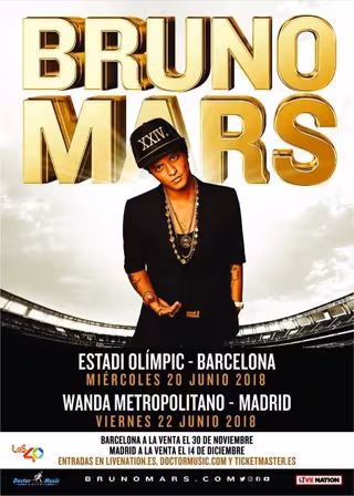 MADRID, 28 Nov. (EUROPA PRESS) - REPORTAJE: 10 canciones que no sabías que son obra de Bruno Mars REPORTAJE: Bruno Mars en 5 canciones CRÓNICA: Bruno Mars en Madrid: El legítimo heredero quiere el trono del pop ya Bruno Mars, ganador de múltiples premios Grammy y varios Discos de Platino, anuncia hoy una serie de conciertos exclusivos en Europa para el verano de 2018. Serán en total seis fechas en España, Francia, Alemania, Escocia e Irlanda en junio y julio del próximo año. Los fans españoles tendrán la oportunidad de disfrutar en directo de 'That's What I Like', '24K Magic', 'Locked Out Heaven' y otros temas del artista en Barcelona, el 20 de Junio en el Estadi Olímpic, y en Madrid el día 22, en el que será el primer concierto que acogerá el Wanda Metropolitano. Las entradas para Barcelona se podrán adquirir a partir de las 10:00h del Jueves 30 de Noviembre a través de doctormusic.com, livenation.es y ticketmaster.es. El precio de las entradas para Barcelona oscilará entre los 45€ y los 130€ (gastos de distribución no incluidos). Las entradas para Madrid estarán disponibles a partir de las 10:00h del Jueves 14 de Diciembre, en los mismos puntos de venta.